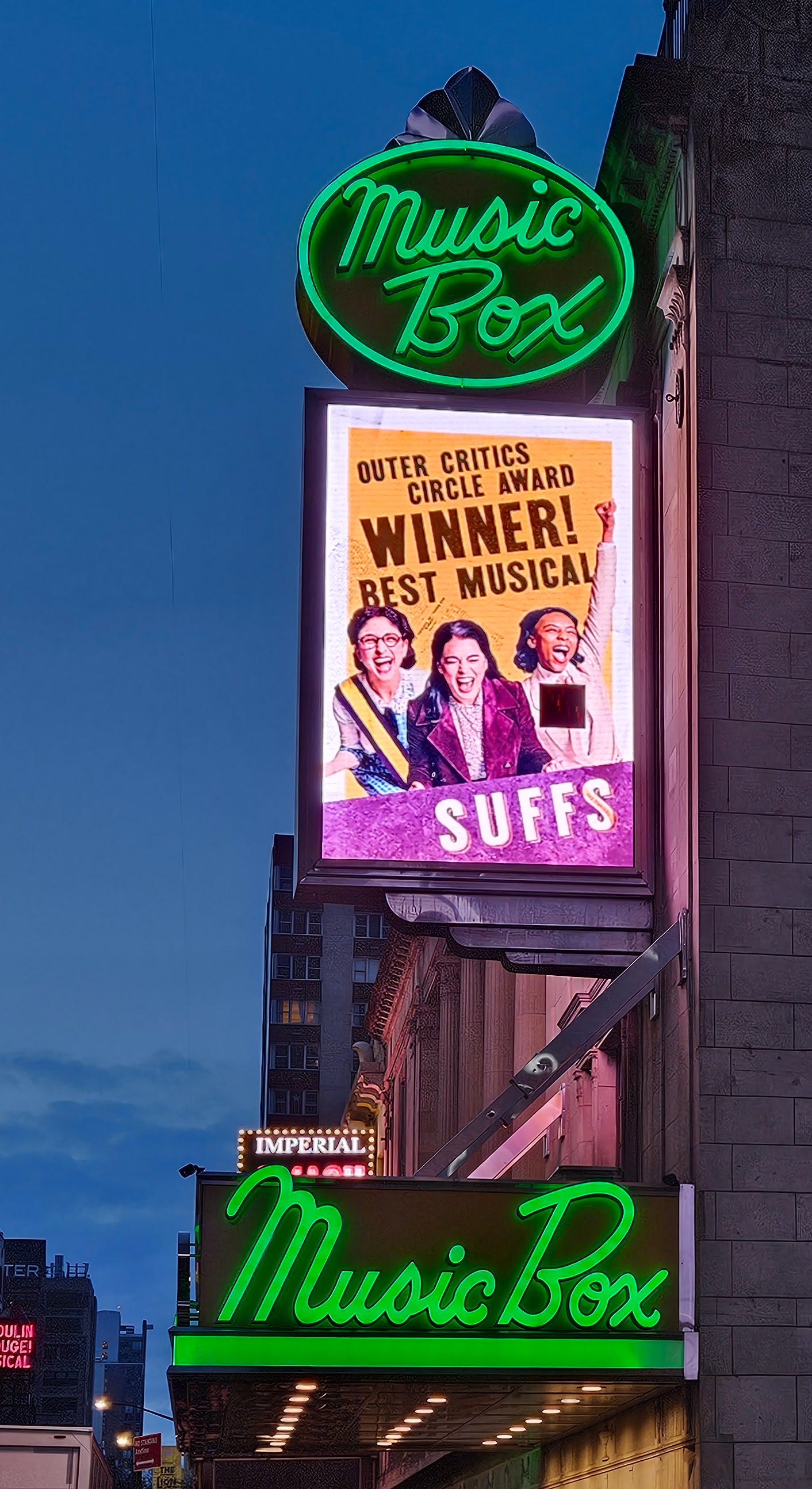 I chatted with Rick Miller, who was leading the ushers for the Music Box Theater, during the intermission. I lamented that the show would end in a week. He said that PBS’s Great Performances recorded one of the shows. He said it was a large production for such a small theatre but that it was expected to continue off-broadway. If you can watch it, I highly recommend it! If you can’t, the soundtrack is available on CD and on streaming platforms. You could also read Doris Steven’s book or watch Iron Jawed Angels on HBO Max.